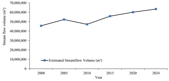 The streamflow volumes for Jammu and Kashmir for the years 2000, 2005, 2010, 2015, 2020, and 2024 were derived from a geospatial hydrological model, integrating precipitation data, land cover-specific runoff coefficients, and flow accumulation datasets. The temporal evolution of streamflow volume is summarized in Table 1 and depicted in Figure 5, revealing a gradual increase over the 24-year study period, from 45.68 million m3 in 2000 to 63.46 million m3 in 2024—a substantial rise of approximately 38.8%.