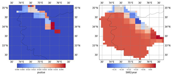 Spatial distribution of Sen’s Slope estimates for SWE trends in Jammu and Kashmir from 1974 to 2024. The left inset illustrates the statistical significance (p-values) of the trends, while the right inset highlights the magnitude of SWE changes (SWE/year).