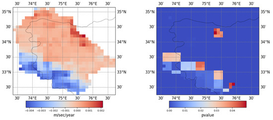 Sen’s Slope estimates for wind speed trends (left) and their corresponding p-values (right) across Jammu and Kashmir over the past 50 years.