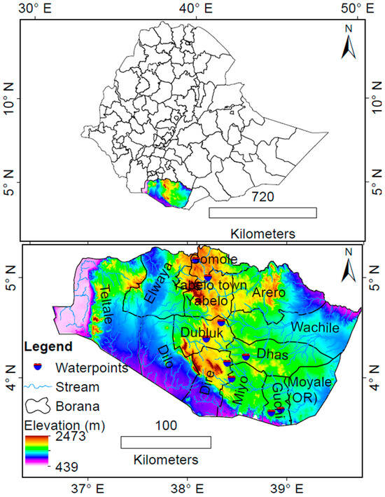 This map displays the location of the Borana Zone (bottom panel), Ethiopia (top panel). The water points indicate the current surface water sources available within the Borana zone. Please note that the names “Arero, Wachile, Dhas, Moyale, Guchi, Miyo, Dilo, Teltale, Elwaya, Gomole, Yabelo, Dubluk, and Dire” refer to the woredas within the study area, the Borana zone. A woreda is the third level of administrative divisions in Ethiopia, following regional states and zones.