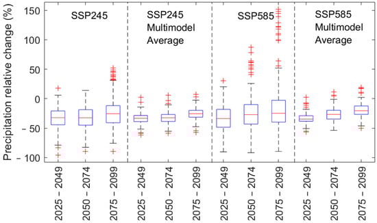 Projected relative changes in precipitation for the Borana zone with respect to the reference period of 1990–2014. The box represents the interquartile range, with the first quartile at the bottom and the third quartile at the top, while the red line inside the box indicates the median. The whiskers extend from the quartiles to the minimum and maximum values, with the lowest and highest data points typically outside the box representing the minimum and maximum, respectively. Red “+” symbols above and below the whiskers indicate outliers, which are unusually high or low data points.