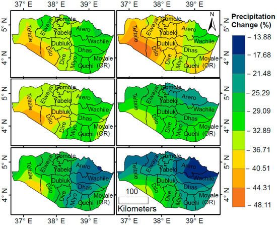 Projected changes in precipitation (%) over the Borana zone calculated using spatiotemporal reliability ensemble averaging (ST-REA) for the periods of 2025–2049 (upper row), 2050–2074 (middle row), and 2075–2099 (lower row). These changes are presented relative to the historical period of 1990–2014, under both SSP2-4.5 (left column) and SSP5-8.5 (right column). Please note that the names “Arero, Wachile, Dhas, Moyale, Guchi, Miyo, Dilo, Teltale, Elwaya, Gomole, Yabelo, Dubluk, and Dire” refer to the woredas within the study area, the Borana zone. A woreda is the third level of administrative divisions in Ethiopia, following regional states and zones.