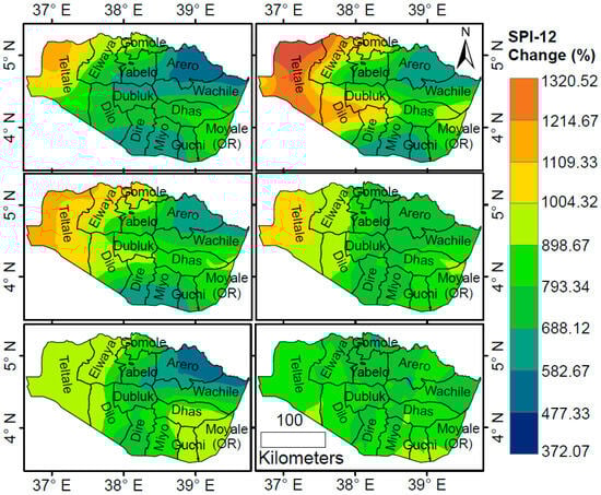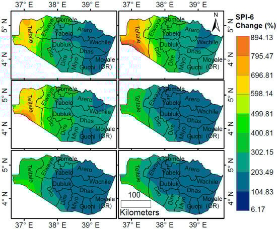 Agricultural drought, estimated by the 6-month SPEI, is projected to increase significantly throughout all regions of Borana (see Figure 6). The western areas will experience the most severe drought, with projections relative to the historical indicating changes from 49.89% to 698.62% in 2025–2049, 100.14% to 817.95% in 2050–2074, and 19.79% to 537.96% in 2075–2099 under SSP2-4.5. SSP5-8.5 presents even more alarming figures, with increases ranging from 108.06% to 894.13% in 2025–2049, 6.17% to 449.13% in 2050–2074, and 26.33% to 450.32% in 2075–2099.