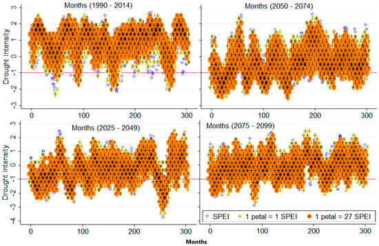 SPEI-12 using SSP2-4.5. Note that the range of the plot represents spatial variability based on the SPEI-12 values of all stations’ data and five GCMs data. SPEI = −1 is shown in the y-axis, as it is the threshold value for the drought IDF curve development.