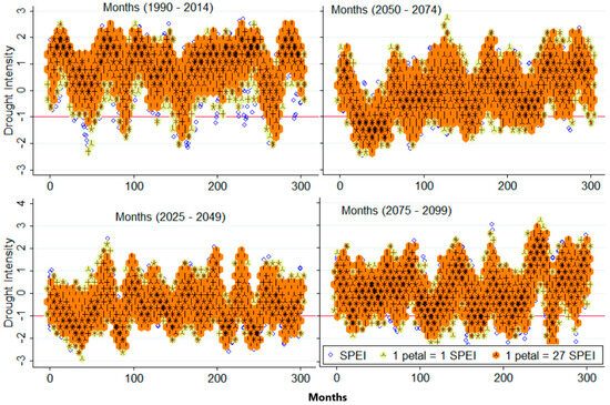 The GCMs’ output is often characterized with high biases compared to the reality in the present-day scenario [42]. Johnson and Sharma [48] highlighted the importance of applying a bias correction in the GCMs’ output for reliable drought projections. They found that using raw climate-model simulations led to inaccurate representations of the region. Before assessing CCI on drought, it is crucial to bias-correct precipitation and temperature outputs from GCMs based on observational datasets. Therefore, applying a bias correction to GCM outputs is a precondition for reliable climatic extreme projection estimations.