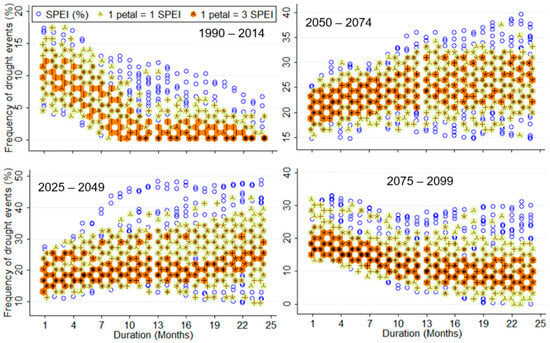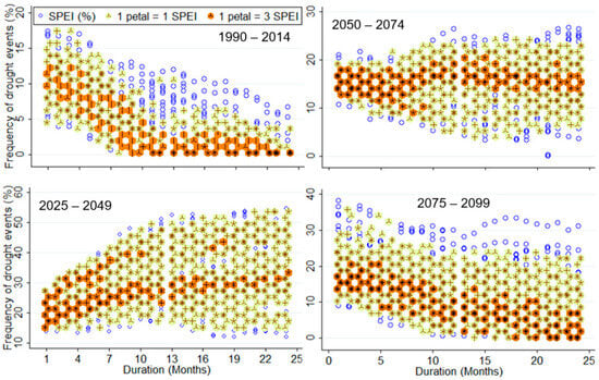 The IDF curves for meteorological (1- to 3-month SPEI), agricultural (3- to 6-month SPEI), and hydrological (12- to 24-month SPEI) droughts in the Borana zone are presented in Figure 10 and Figure 11. These IDF curves are calculated using data from all GCMs, and they encompass values from all monitoring stations, thereby capturing both the uncertainty inherent in GCMs and the spatial variability of drought occurrences. The IDF with drought intensity of an SPEI value of less than −1 illustrates how the frequency of droughts changes over varying durations. Specifically, it depicts the relationship between the drought duration (measured in months) and drought’s expected frequency. To visualize these data, density distribution sunflower plots are employed. In these plots, dark sunflowers signify high-frequency drought events, while light sunflowers represent moderate-frequency events. Each petal of a dark sunflower corresponds to 23 SPEI values, indicating a robust representation of drought events, while each petal of a light sunflower represents a single SPEI value, denoting less frequent occurrences. This visual representation aids in comprehending the frequency of droughts across different durations. The analysis reveals that the spatial variability of droughts increases as we move from meteorological (1- to 3-month SPEI) to agricultural (3- to 6-month SPEI) and finally to hydrological droughts (12- to 24-month SPEI). This progression indicates that, as drought conditions persist, their impact amplifies across different systems, affecting agricultural productivity and water resources. Projections for the periods of 2025–2049 and 2050–2074 indicate a significant rise in drought occurrences under both SSP2-4.5 and SSP5-8.5 as the drought propagates from meteorological into agricultural and hydrological systems. Interestingly, the baseline period (1990–2014) and the projected period (2075–2099) demonstrate greater vulnerability of the meteorological and agricultural systems to climate change.