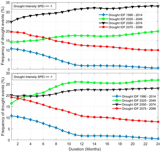 Drought intensity–duration–frequency (IDF) curves that are derived from the multi-model ensemble average and aggregated across all stations under SSP2-4.5 (top) and SSP5-8.5 (bottom) scenarios.