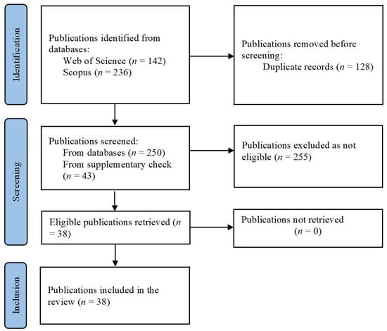 Having searched the databases, we performed a supplementary check for any missed but relevant references, following an approach adopted by similar studies [27]. For this, we consulted the reference lists of two relevant review articles [2,4]. The lead author screened each referenced publication in the mentioned reviews and selected for further screening all those whose title, abstract, or keywords contained the relevant search terms used to collect publications from the two databases. This added 43 additional publications and left us with 294 publications in total, as presented in a PRISMA flowchart (Figure 1).