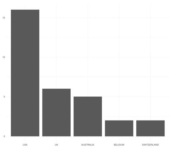 The country of affiliation for the first authors of the eligible publications. Note: n = 38 publications.