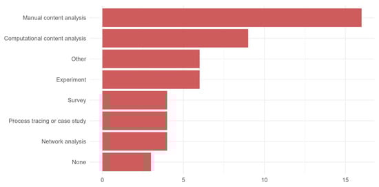 We also found that the most common channel for the dissemination of manipulated information examined in the publications was text-based social media posts appearing on older types of platforms—Twitter and Facebook. Visuals-focused channels like Instagram, TikTok, and YouTube received less attention, despite these latter platforms occupying a prominent place in the media diet of audiences [5]. That being said, about a third of the analyzed publications did not specify the channel they examined.