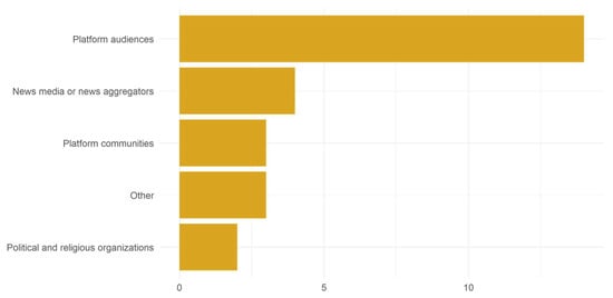 The sources of manipulation studied. Note: n = 26 publications that identified or proposed the source of manipulation. The category ‘Platform communities’ refers to defined or organized units on a platform, such as groups or pages, while ‘Platform audiences’ refers to broader and undefined cohorts of users. ‘Other’ refers to any source that is not listed in the figure but is found in the publications, such as automated accounts, memes, or search engines.