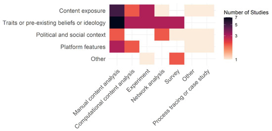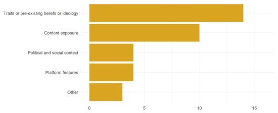 Content exposure also featured highly on the list of exacerbating variables. This refers to users’ exposure to climate change content from all types of sources, including right-wing or fact-checking organizations, activists, and ordinary individuals discussing a climate disaster [36,41,42]. However, we know less about content exposure effects as the studies tended to focus instead on a broader range of methods to study traits, beliefs, and ideology (Figure 7).