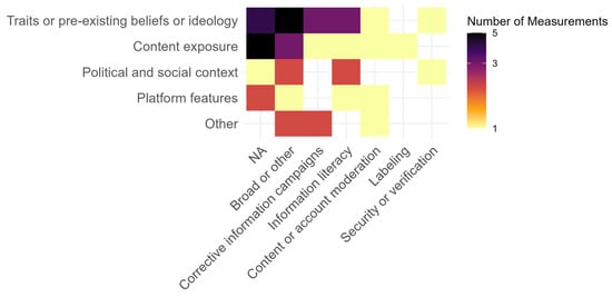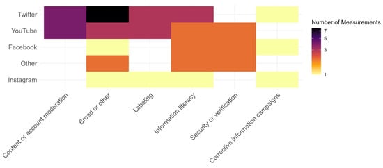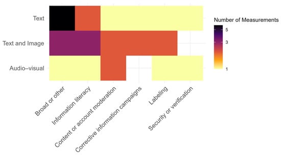 Figure 9 shows how the proposed interventions depend on the format of the studied manipulation: content or account moderation seems to be the most promising intervention if manipulative information is presented in an audio–visual format. At the same time, information literacy campaigns can address manipulative content presented in a textual or visual format. For instance, Anderson and Becker [36] suggested adding humor and sarcasm factors to YouTube video content related to climate change issues to engage more audiences who have a low interest in this field. Twitter and YouTube were the platforms on which the studies proposing an intervention focused, and roughly the same types of interventions were recommended for both, despite multiple differences in affordances and design (Figure 10). In another study, Buchanan et al. [44] advocated using content moderation by removing potential manipulation with the help of an algorithmic approach. It is important to highlight that the majority of the reviewed studies did not test the interventions they proposed.