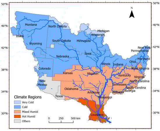 The basin crosses four major distinct weather regions [29]: Very Cold, Cold, Mixed Humid, and Hot Humid. The Very Cold region, located primarily in the northern parts of the basin, experiences long, harsh winters and shorter growing seasons, impacting soybean growth. The Cold region, found just south of the Very Cold zone, has a somewhat milder weather dynamics but still features significant seasonal variation, with warm summers and cold winters. The Mixed Humid region, stretching across the central part of the basin, is characterized by moderate temperatures and balanced rainfall throughout the year, providing a favorable environment for soybean cultivation. Finally, the Hot Humid region, located in the southern part of the basin, experiences warm temperatures year-round with high humidity and ample rainfall, which can both benefit and challenge soybean production due to potential for excessive moisture and heat stress. Figure 1 shows the study area of the Greater Mississippi River Basin with its different weather regions, highlighting the mean annual flows from runoff across these diverse weather regions.