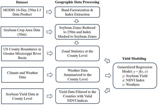 The overall schematic diagram for geographic data processing and yield modeling is shown in Figure 2. Geographic data processing consists of five major steps. Step 1 aims to extract the NDVI layer from the MODIS Vegetation Indices 16-day L3 Global 250 m data and multiply with the scale factor, which transforms the NDVI DN values into its standard range from 0 to 1. Notice that the soybean planting area data have a higher spatial resolution (30 m) than the remotely sensed NDVI images (250 m). It is necessary to first downscale the soybean planting area data, as shown in Step 2, to ensure that the whole monitored area of each extracted NDVI pixel (250 m × 250 m) is located within soybean fields. Then, we mask the NDVI layer with the soybean planting area for soybean crops to extract the corresponding vegetative growth indices. After that, Step 3 aims to summarize the NDVI values for each county in the study area, including mean, standard deviation, minimum, and maximum of NDVI. Similarly, Step 4 summarizes the weather data for each county, including the mean precipitation, the minimum temperature, and the maximum temperature. The soybean yield data are filtered to the counties with NDVI and weather data statistics. These steps were conducted for each of four weather zones and the county-level masked data were processed for crop yield modeling and the relationships between the crop yield and NDVI-based vegetative growth indices or weather variables.