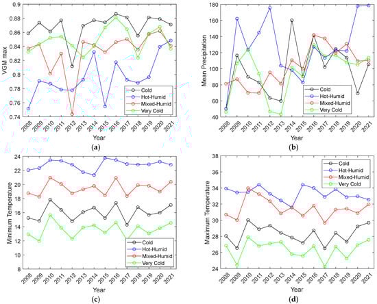 The temporal pattern of VGMmax (a) and three corresponding climatic factors: mean precipitation (b), minimum temperature (c), and maximum temperature (d).