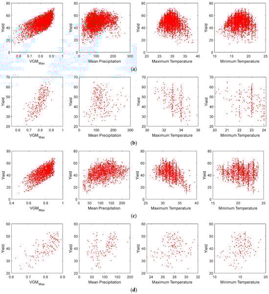The relationship between the yield and four explanatory variables: VGMmax, mean precipitation, maximum temperature, and minimum temperature at the county level in (a) Cold, (b) Hot Humid, (c) Mixed Humid, and (d) Very Cold regions.