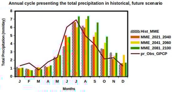 To analyze the annual variability of the Indian Summer Monsoon, a temporal time series is presented in Figure 1 for both historical and future scenarios. The annual cycle over the Indian subcontinent (65° E–95° E, 5° N–40° N) highlights an increase in precipitation under global warming scenarios.