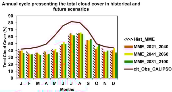 The temporal time series of total cloud fraction for the observational, historical, near, mid, and far-future periods under SSP5-8.5 is shown in Figure 3.