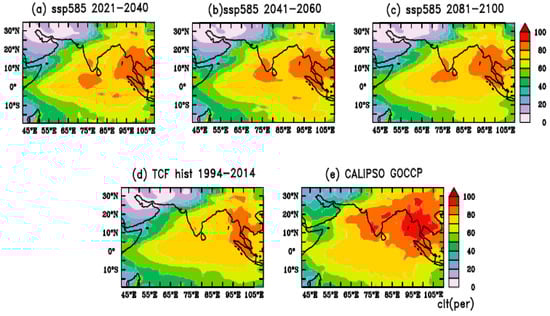 Spatial pattern of total cloud fraction (%) for JJAS of MME in near- (2021–2040), mid- (2041–2060), and far-future (2081–2100) terms in SSP5-8.5 scenario; compared with historical (1984–2014) and observational dataset (CALIPSO-GOCCP) along the South Asian region.