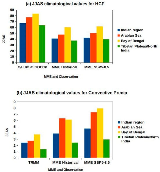 (a) Mean JJAS value for High Cloud Fraction under SSP5-8.5 far-future (2081–2100) projection for different regions (area mentioned in Figure 8), (b) Mean JJAS value for Convective Precipitation under SSP5-8.5 far-future (2081–2100) projection for different regions (area mentioned in Figure 8).