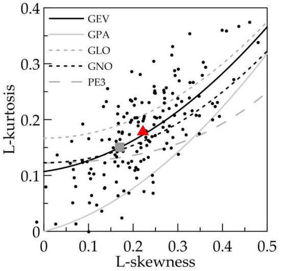 Figure 2. L-moments ratio diagram for the statistic distributions Generalized Extreme Value (GEV), Generalized Normal (GNO), Generalized Logistic (GLO), Generalized Pareto (GPA), and Pearson Type III (PE3). The gray square represents the Gumbel distribution (GEV type I), while the red triangle indicates the mean value.