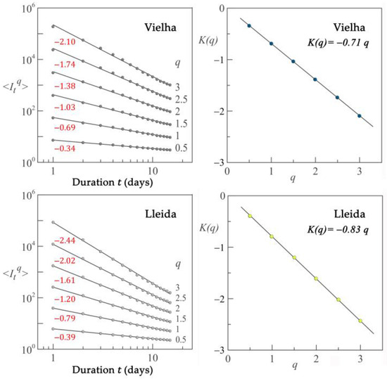 Figure 4. At the left, log–log plots of statistical moments versus duration for two selected stations, Vielha and Lleida. The slopes of each fitted line are indicated in red. On the right, the linear regression of these slopes for each order q , confirming scaling behavior in both cases.