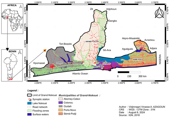 Located between 6°18′ and 6°30′ N latitude and 2°02′ and 2°40′ E longitude, Grand-Nokoué is bordered to the north by inland communes, to the south by the Atlantic Ocean, to the east by Nigeria and to the west by the commune of Grand-Popo (Figure 1). Grand-Nokoué has a synoptic station (6°21′ N and 2°23′ E) that records and provides the various climatic parameters of the region.