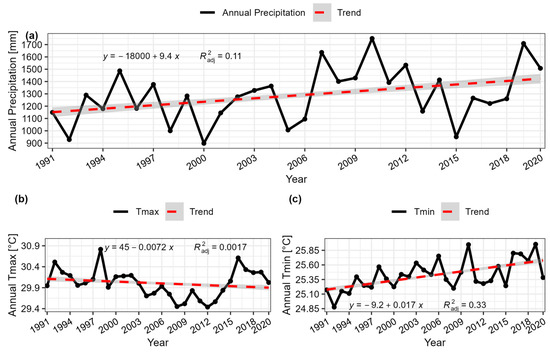 Interannual trend in pcp (a), Tmax (b) and Tmin (c) from 1991 to 2020 at the Cotonou station.