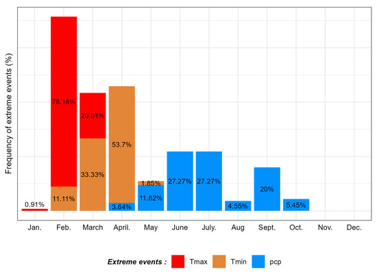 Figure 4 below illustrates the monthly proportions of extreme events. It shows that precipitation extremes are spread over seven consecutive months, starting in April. The highest peaks are recorded in June (27.27%), July (27.27%) and September (20%). The difference in the monthly number of extreme precipitation events is statistically highly significant (p-value < 0.001). As for the Tmax extremes, they are mainly distributed in the months of February and March, representing, respectively, 78.18% and 20.91% of the total recorded in the last thirty years. The Chi-square test applied at the 5% threshold shows a p-value < 0.001, indicating highly significant differences in the occurrence of Tmax extremes. Furthermore, extreme Tmin events are recorded for four consecutive months, starting in February. The numbers recorded in March and April are higher, accounting for 33.33% and 53.7%, respectively, of all Tmin extremes over the thirty-year study period. Since the p-value of the difference test is <0.001, we can conclude that the monthly evolution of these events is in no way related to chance.