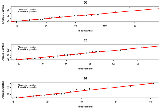 The quality of the generalized extreme value (GEV) distribution model is estimated for each climate parameter by comparing the theoretical quantiles (predicted by the model) with the empirical quantiles (derived from observed data) using quantile–quantile plots. This test is one of the simplest and most effective techniques for assessing model quality [57]. Figure 5 shows the QQ plots for the distributions of the three highlighted climate parameters (pcp (Figure 5a); Tmax (Figure 5b); Tmin (Figure 5c)) at the Cotonou station. Most of the points are aligned with the reference line, indicating that the GEV model provides a satisfactory fit to the observed data. However, there are some deviations at the extremes, mainly in the precipitation data (Figure 5a), which could indicate a slight deviation in the fit of the tails of the distribution (very extreme events). These deviations at the extremes highlight the possible limitations of modeling the rarest events (100 years), which may require the exploration of additional covariates.