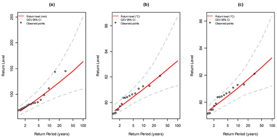 After characterizing the parameters of the two models, the nonstationary was fitted to the annual maximums of the three-day accumulations of the pcp variables, Tmax and Tmin, with a 95% confidence interval, to determine the magnitude of the specific return periods. Calculations were performed using the R software packages exTreme 2.0 [62], lmomRFA [63] and lmom [44,64].