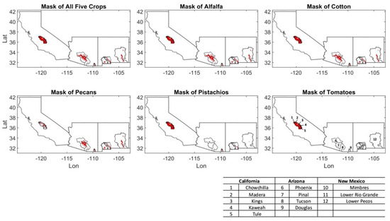 Arizona’s Active Management Areas (AMAs) were established by the 1980 Groundwater Management Act to curb overdraft and regulate groundwater use in parts of the state with heavy reliance on groundwater [26]. While each AMA has different overarching management goals, for agricultural water users in these AMAs, important management specifications include required groundwater management plans that incorporate conservation, water metering for high-pump-rate wells (>0.13 m3 min−1), annual water use reporting, and a prohibition on the irrigation of new agricultural lands [27]. We focused on the four Arizona AMAs that are co-located with notable production of our crops of interest.