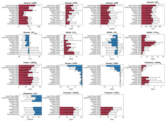 Changes in general and crop-specific metrics between the observed contemporary (1981–2010) and modeled future (2045–2074), where red bars indicate a numerically positive change and blue bars indicate a numerically negative change. The bar value represents the 24-model mean value of change and black lines show the range in change values over the 24 models.