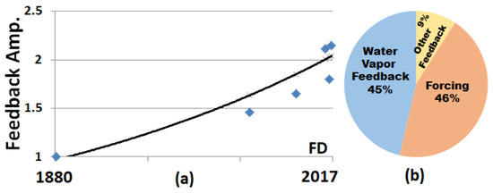 Figure 8c,d p-values are 0.00289 and 0.00084, respectively. These are well below the 0.05 level indicating reasonable statistical significance. However, we note that Figure 8d is confounded since the unity value in the likely fit for upper data points falls around 1940 instead of closer to 1880. However, these exponential fits are helpful as often authors estimate that feedback likely increases exponentially in time. As well, climate amplification is often viewed to have started around 1950 in most graphical estimates [30] so the 1940 value in Figure 8d may be somewhat acceptable.