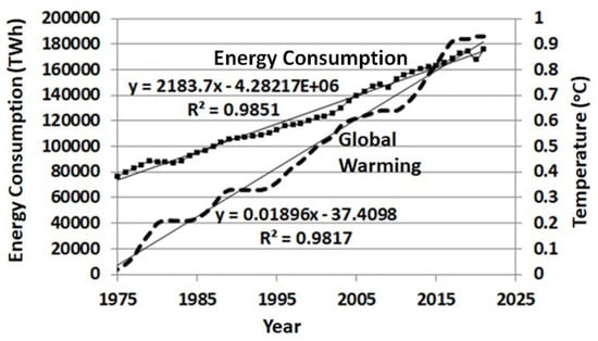 In Figure 2, the global warming (GW) trend (land and ocean) is shown by the bottom line [30] (see Appendix A). These data are smoothed as provided by NASA [30]. An ordinary t-test on energy consumption and unsmoothed global warming data finds a p-value of 1 × 10−30, showing a strong likely relationship between the two datasets, with a Pearson correlation of 93.4% for unsmoothed GW data and 98.88% for smoothed GW data (see Appendix A). However, it appears that GW is increasing at a faster rate than EC.