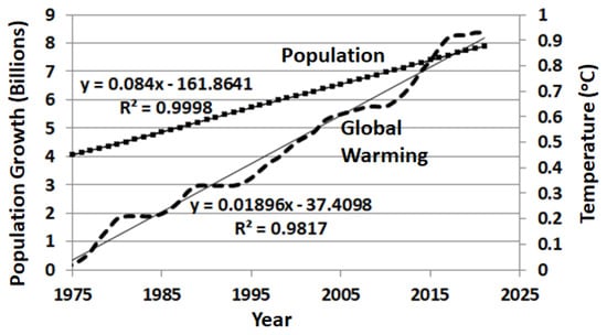 Topline, population growth [31] (see Appendix A), and bottom line, global warming [30] (see Appendix A). The equations shown are for the linear trend lines.
