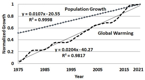 Topline, normalized population growth (Appendix A), and bottom line, global warming (Appendix A). The equations shown are for the linear trend lines.