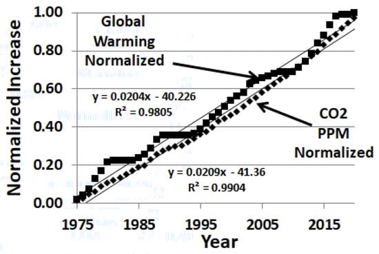Using the normalized unitless data methods reduces complexity so that slopes displayed in the graph can be compared. Assessing slopes also reduces time lag issues when the gradients are fairly constant over time, providing high statistical confidence (see Section 3.1.1). The following normalized correlated rates (NCRs) are found for the period of 1975–2021: 0.0204/year for global warming, 0.0209/year for CO2 increase, 0.0107/year for population growth, and 0.0124/year for energy consumption. Data are highly correlated in Figure 5 and Figure 6, for smoothed data with statistically significant correlations with R ≥ 0.99, and R ≥ 0.965 for unsmoothed data in Appendix A. The NCR assessments indicate that global warming and CO2 (Figure 7) are increasing by a factor of 1.9 times faster than population growth and 1.65 times faster than energy consumption. However, when this is adjusted to the earlier period (1880–2021), the global warming normalized slope is 0.0181/year (see Figure 6b). To obtain an early post-industrial estimate from 1880–1974, a 0.15 °C approximate rise [30] was added to each data point, yielding an increase in 2021 of 1.05 °C (Appendix A). This changes the normalization factor, which changes the slope (see Figure 6b). These early post-industrial NCR assessments are lower and indicate that global warming is increasing by a factor of 1.62 times faster than population growth and 1.46 times faster than energy consumption for the years 1900–2021, with the average year in this interval of 1960.