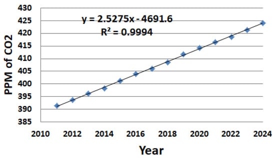 - NOAA. Global Monitoring Laboratory. CO2 Increase Per Year. 2023. Available online: https://gml.noaa.gov/ccgg/trends/gl_gr.html (accessed on 15 December 2023).