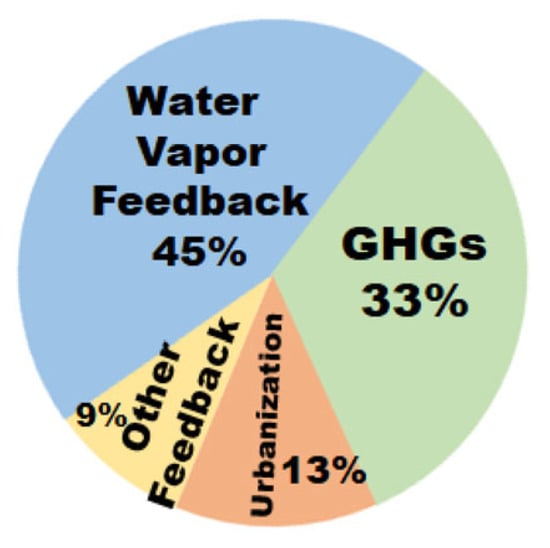 In Section 3.4, urbanization GW influences are detailed and supported up to the 13% GW level. In Section 3.5, the supportive work of Zhao et al. [9] is noted, who reported that UHIs in wet climates are about 3.3 °C higher than comparable UHIs in dry climates. Feinberg [10] reported that the WVF of UHIs in wet climates, based on Zhao et al.’s [9] study, found values over a factor of two higher than the background WVF climate. We note that about 67% of the population lives in humid mostly urban climates [11,12] where negative SG (dark roads, roofs, etc.) is unrestricted.