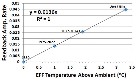 Figure 8a displays the NCR analysis results in Table 2 for feedback amplification trends from 1975 to 2019 using the EC NCR approach. Figure 8b displays the additional data point due to Hansen et al.’s [34] pipeline estimate of global warming increase affecting feedback (see recent trends in Section 4). This increase in feedback in Figure 8b may be due to the surge in water vapor, displayed in the figures of Section 4 in the period from 2022 to 2024, and is discussed in Section 3.2.1 and Section 4. Note in Figure 8a,b a linear fit was used and it is easier to note the amplification trend is increasing at about 0.136 per decade which compared well to the exponential fit used in Figure 8c,d.