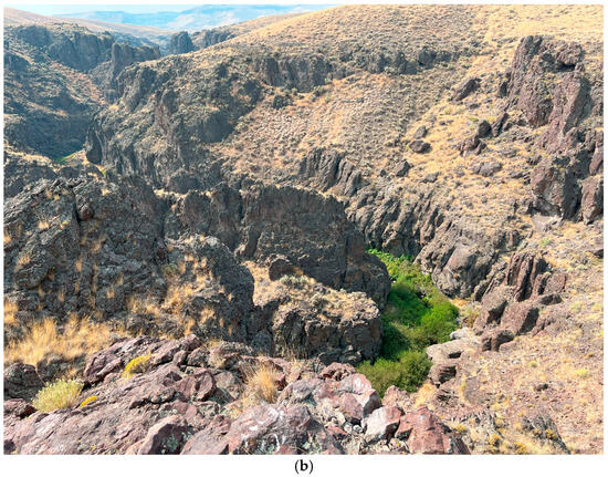 We surveyed a 600 m thalweg distance (400 m Euclidean distance) reach of Little Jacks Creek (LJC), a desert stream in southeast Idaho’s semi-arid sagebrush steppe biome (Figure 1a). The cold desert LJC stream habitat is characterized by intermittent streamflow and dense riparian vegetation, mostly consisting of willows (Salix sp.) [30]. The reach for our survey is nestled approximately 50 m deep in the basalt canyon of the surrounding steppe (Figure 1b). The streambed is predominately silt, clay, and sand with a high degree of embedded cobbles [31]. LJC is approximately 50 km in length, originating at an elevation of 1900 m in the LJC Wilderness Area. At no more than 5 m wide in most sections, this snow-fed creek contributes to the Snake–Columbia River watersheds, supports wild Redband trout populations, and provides water for downstream agriculture [31]. Air temperatures in this area range from approximately −17C during winter to 41C during summer, and precipitation averages 26 cm annually at the nearest NOAA weather station in Murphy, ID [32]. During our survey period, air temperatures ranged from 6C to 29C [32]. Sunrise and sunset were at approximately 6:22 a.m. and 7:03 p.m., respectively. Streamflow was previously measured 2 km upstream, averaging 18 cm/s [33]. LJC and the surrounding lands are mainly managed by the Bureau of Land Management as the 51,000-acre Little Jacks Creek Wilderness Area, which provides numerous hiking and wildlife viewing opportunities [34].