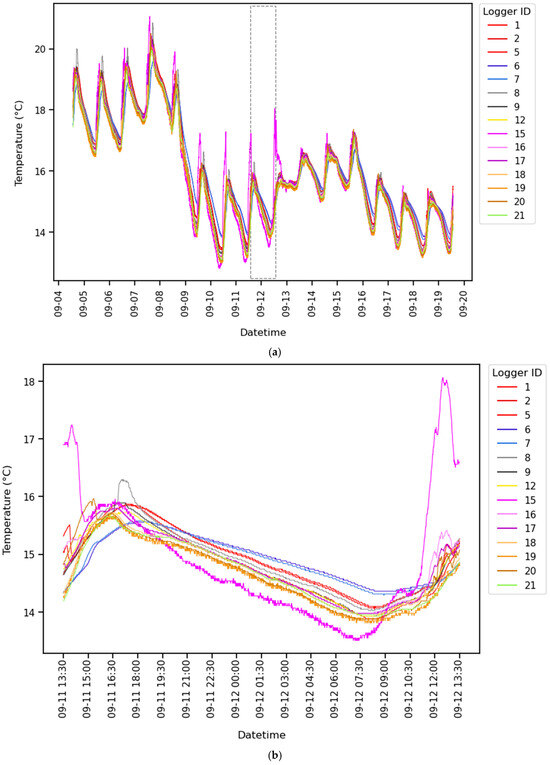 The diurnal variation in stream temperatures was highlighted with the data from the in-stream temperature loggers (Figure 4a). Stream temperature values from all loggers ranged from toC during the survey (Figure 4b), with variation both diurnally and spatially. The loggers placed within the same pools tended to follow similar temperature patterns even if they were slightly different than groups of loggers in other pools, except for logger 15. Logger 15 showed a consistent pattern, overestimating temperatures around 12:00 to 13:00 h every day, showing a >C difference compared with all other loggers during that time; it then decreased back within the temperature range of the other loggers by around 13:30 h each day (Figure 4). This may have been because it was placed in a shallower, rocky riffle stretch where water temperature increases more easily, so we left it in the dataset.