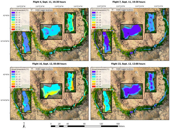 We produced multispectral and TIR orthomosaics with a ~67 cm pixel resolution for each flight, and the TIR orthomosaics with the most well-defined stream edges were from flights 22 (11:00 h) and 23 (12:00 h) (Figure 5). Our TIR maps revealed potential refuge locations on several flights, and they highlighted relative changes in stream temperatures over a 24 h period (Figure 5). In the late afternoon (16:30 h), the cooler portions of the stream were on the western side, providing refuge during the hottest period of the day (Figure 5). In the evening (19:30 h), the stream began to cool, and temperatures became more homogenous, with the left side remaining marginally cooler. In the early morning (05:00 h), the left side of the stream retained slightly cooler temperatures than the right. The stream corridor in this flight and others that were between sunset and sunrise were not as well aligned to the stream corridor shown in the RGB orthomosaic, making them difficult to delineate with the stream boundary polygon digitized from the RGB orthomosaic, so there was a slight spatial shift in the TIR data for those night flights (Figure 5). Closer to noon (12:00 h), the left side grew warmer than the right side of the reach, where the right side contained larger, cooler patches.