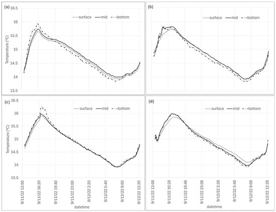 The in-stream temperature loggers tethered at the surface, middle, and bottom depths showed that there were significant differences for the southwest and central stratified logger sets when using a Kruskal–Wallis test with Holm–Bonferroni corrections () (Table 2). However, the mean water column temperatures for each water column level were within C of each other, with standard deviations ranging from to C (Table 2; Figure 6), and the HOBO Tidbit v2 instrumental accuracy was C. We continued with the assumption that the logger surface temperatures were representative of the full column temperatures because two of the four stratified logger sets did not result in significant differences between the surface, middle, and bottom loggers; the means of each logger set were within the error range of the instrument to each other; and we surveyed during seasonal low flows with well-mixed conditions [38].