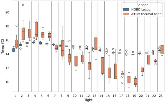 Boxplots of LJC temperatures from the in-stream HOBO loggers and the Altum thermal band at the location of each in-stream logger for all 23 UAS flights, with flight 1 commencing at 13:30 h on September 11 and flight 23 commencing at 12:00 h on September 12. Circles show outliers for both HOBO logger and Altum values.