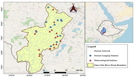 The Omo–Gibe River Basin is located in Southwestern Ethiopia [67]. Geographically, it is located at 4°30′00″–9°30′00″ N latitude and 35°0′00″–39°0′00″ E longitude (Figure 1). The Omo–Gibe River discharges into Lake Turkana, Kenya, with a drainage area of approximately 79,000 km2 (Figure 1). The elevation ranges from 361 m to 3600 m above sea level [68]. The mean annual air temperature of the basin is between 24 °C and 17 °C in the western highlands and above 28 °C in the southern lowlands [69]. The mean annual precipitation ranges from 1950 mm/year in the highlands to below 450 mm/year in the southern lowlands. The basin is unimodal in the northern and central parts and bimodal in the southern part of the basin. The basin also experiences a rainy season from June to August (summer) and a dry season with no or little rain (autumn and winter). As stated in [70] the total average annual flow of the basin is estimated to be 17.4 billion cubic meters (BCM) (m3) or 14.5% of the country’s total.