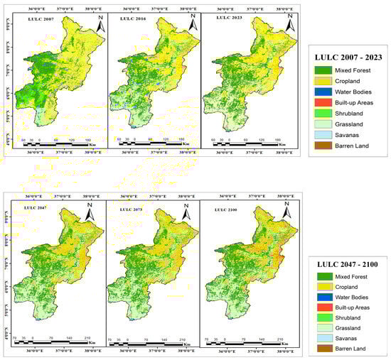 Historical and projected LULC patterns of 2007, 2016, 2023, 2047, 2073, and 2100 in the Omo–Gibe River Basin.