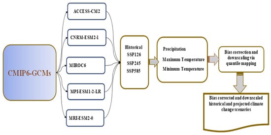 Coupled Model Intercomparison Project Phase 6 (CMIP6) GCMs were used in the present study to analyze future climate change. Five CMIP6 GCMs were selected based on the data availability and continuity, suitability for the study area, and the models’ performance according to the previous studies [75]. The CMIP6 GCMs selected for this study were ACCESS-CM2, CNRM-ESM2-1, MIROC6, MPI-ESM1-2-LR, and MRI-ESM2-0 (Figure 4 and Table 2). From these models, historical and projected variables such as precipitation and maximum and minimum temperatures were extracted. Future changes in precipitation and maximum and minimum temperatures were evaluated considering the historical and projected variables from future climate scenario shared socioeconomic pathways (SSPs) in the case of CMIP6 for SSP1-2.6, SSP2-4.5, SSP3-7.0, and SSP5-8.5. The SSP1-2.6 experiments [76] a future pathway with low radiation forcing, with SSP2-4.5 medium and SSP5-8.5 high radiation forcings. Three future periods were proposed: (1) 2023–2047, (2) 2048–2073, and (4) 2074–2100.